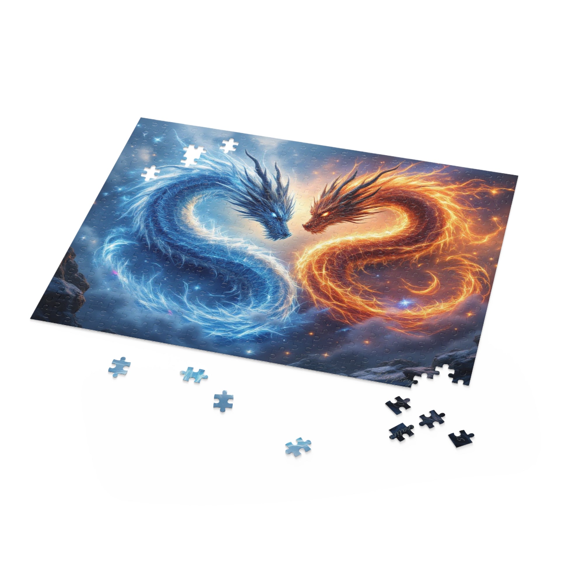 Unleash the power of dueling dragons with our mystical puzzle design. Features a dramatic scene of fire and ice dragons in an epic encounter, perfect for creating an enchanting puzzling experience while building a beautiful piece of art.